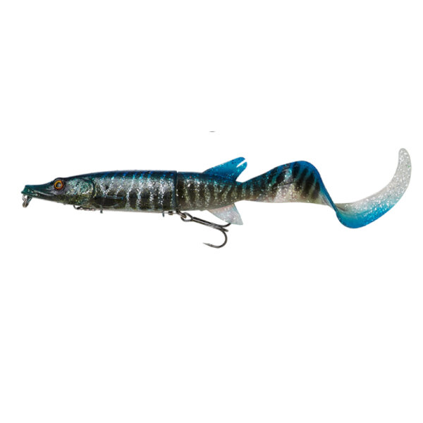 Eine super realistische Nachahmung eines kleinen Hechtes mit innovativen Funktionen! Die gescannten 3D Daten sind unvergleichlich und werden die meisten Raubfische täuschen! Sie können sicher sein, dass Sie brutale Angriffe bekommen! Der Paddelschwanz gibt dem Köder eine unglaubliche, lebendige Schaukelbewegung und das Klicken der Rasselkammer macht die Raubfische verrückt! Der Twisterschwanz kann extrem langsam gefischt werden, sodass der vordere Teil des Köders sehr stabil läuft und der Schwanz eine verlockende und anregende Wirkung erzeugt. Eine tödliche Kombination für große vorsichtige Hechte! Wenn der Schwanzbogen nach unten geschraubt ist, erzeugt es Vortrieb am Heckteil, sodass der Kopf nach unten gedrückt wird. So läuft er unter der Oberfläche in der gleichen Tiefe. Drehen Sie den Schwanzbogen nach oben, und der Schwanz erzeugt eine die Aufwärtsneigung, die den Kopf nach oben zwingt. Der Hecht kommt an die Oberfläche und verläuft auch direkt dort, weshalb ein super "Wach-auf-Effekt" erschaffen wird!